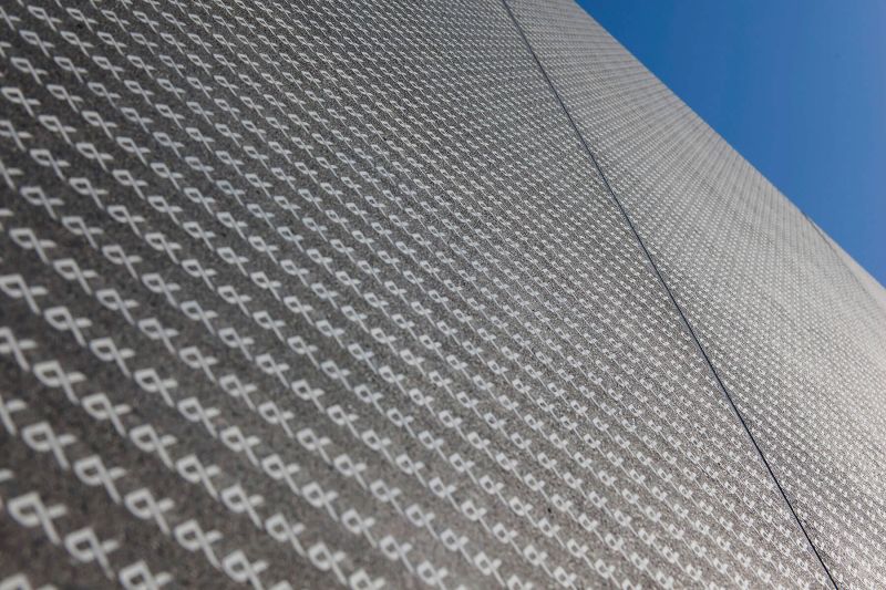 The repetitive, unique pattern in Graphic Concrete on the Keiyo Bank's facade is made of the bank's logo.