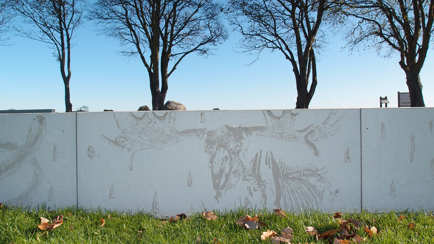 Etched into the surface of the concrete, the images are discreetly revealed, as they would appear in the quarry walls. While walking along the park's main path, visitors can follow the timeline, which covers a huge expanse of time. It starts with an asteroid hitting the earth approximately 65 million years ago, moves on to the fossils of the Danian Age and the Ice Age, and ends in the present day with children chiseling at fossils in the limestone quarry - a popular activity in the quarry today.