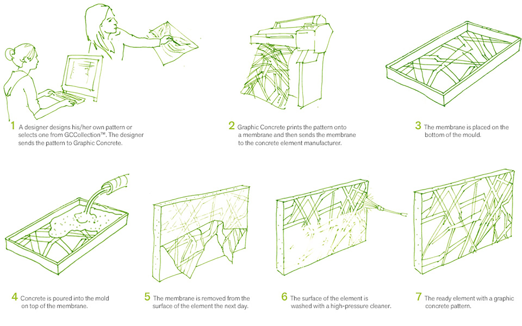 The Graphic Concrete technology is the printing of your visual idea on a special paper and transferring it to a concrete surface in the precast process.